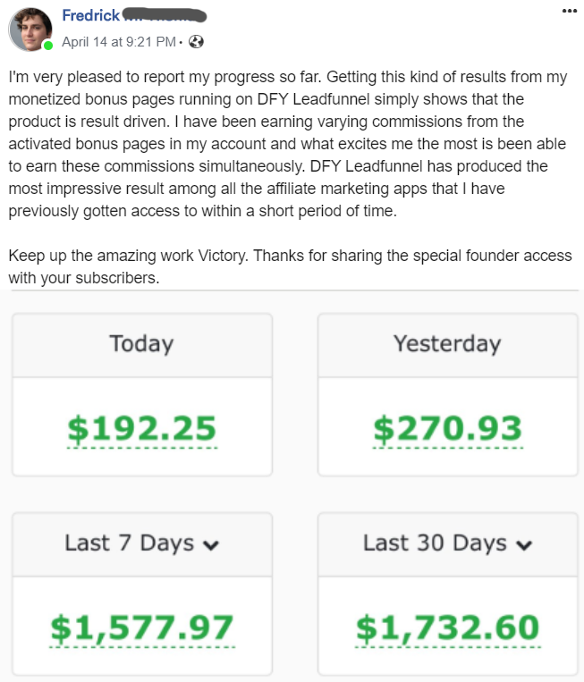 It doesn't get realer than this. I am NOT one of those marketers who solely rely on launch profit to earn a living online so there's no reason to promise you thousands of dollars that you may not achieve in 30 days. I am about to welcome you into my tribe so I have to build our business relationship on "Trust". Whether you are a lazy fellow or even worse, DFY LeadFunnel will at least generate $1880 per month for you if you quickly activate your account now that you're right in front of your PC. I can comfortably guarantee you $2k per month with this app.